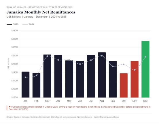 Monthly data show net remittances turned negative year-on-year in October and November as the storm disrupted economic activity across western Jamaica and dampened the informal transfer networks that underpin diaspora flows. November 2025 net remittances of US$267.6 million were down 4.6 per cent from the same month a year earlier. The recovery was swift: December net inflows surged to US$315.3 million, a 13.6 per cent jump over December 2024 and the sharpest monthly gain of the year, driven by a US$36.2 million increase in gross inflows as diaspora communities in the United States, United Kingdom and Canada sent relief and reconstruction support.