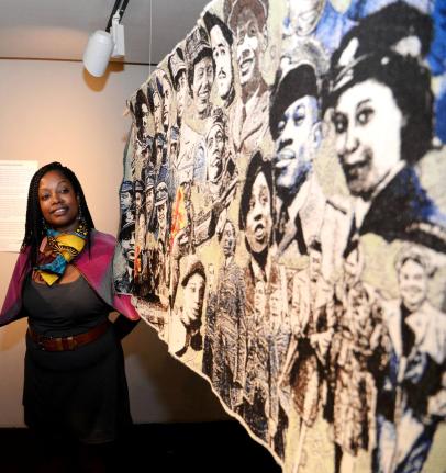 Paula Ogun Hector, creative director and curator of Tapestry of Black Britons, is pictured alongside one of the specially embroidered panels.